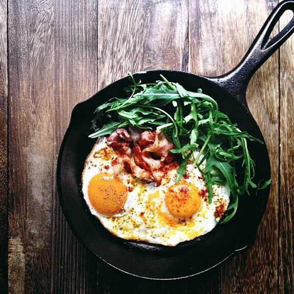 Wouhaaaa ce plat avec des oeufs au plat, du bacon et de la roquette me donne envie de plonger dans la photo et de tout manger 8D