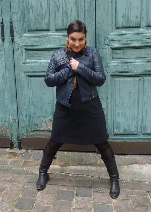 très sympa, le look robe-perfecto-foulard-bottes ! :-)
