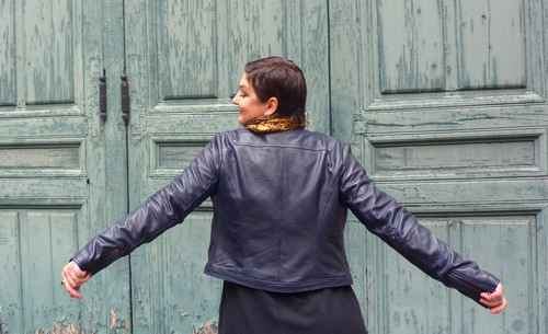Par contre une petite question (je suis une inculte profonde en matière de veste en cuir, oui oui, même si mon rêve serait d’en avoir 10, avec 100 manteaux et sacs différents, 200 foulards et 100 paires de chaussures… C’est grave docteur?) Il ne te serre pas un peu? J’ai l’impression qu’il doit te coller un peu trop au niveau des manches et vu que tu ne le fermes pas, j’ai du mal à me faire une idée… Mais tu as certainement quelque chose de chaud en dessous? Et peut être que ça ne se ferme pas (que c’est plus « fashion » comme ça?)