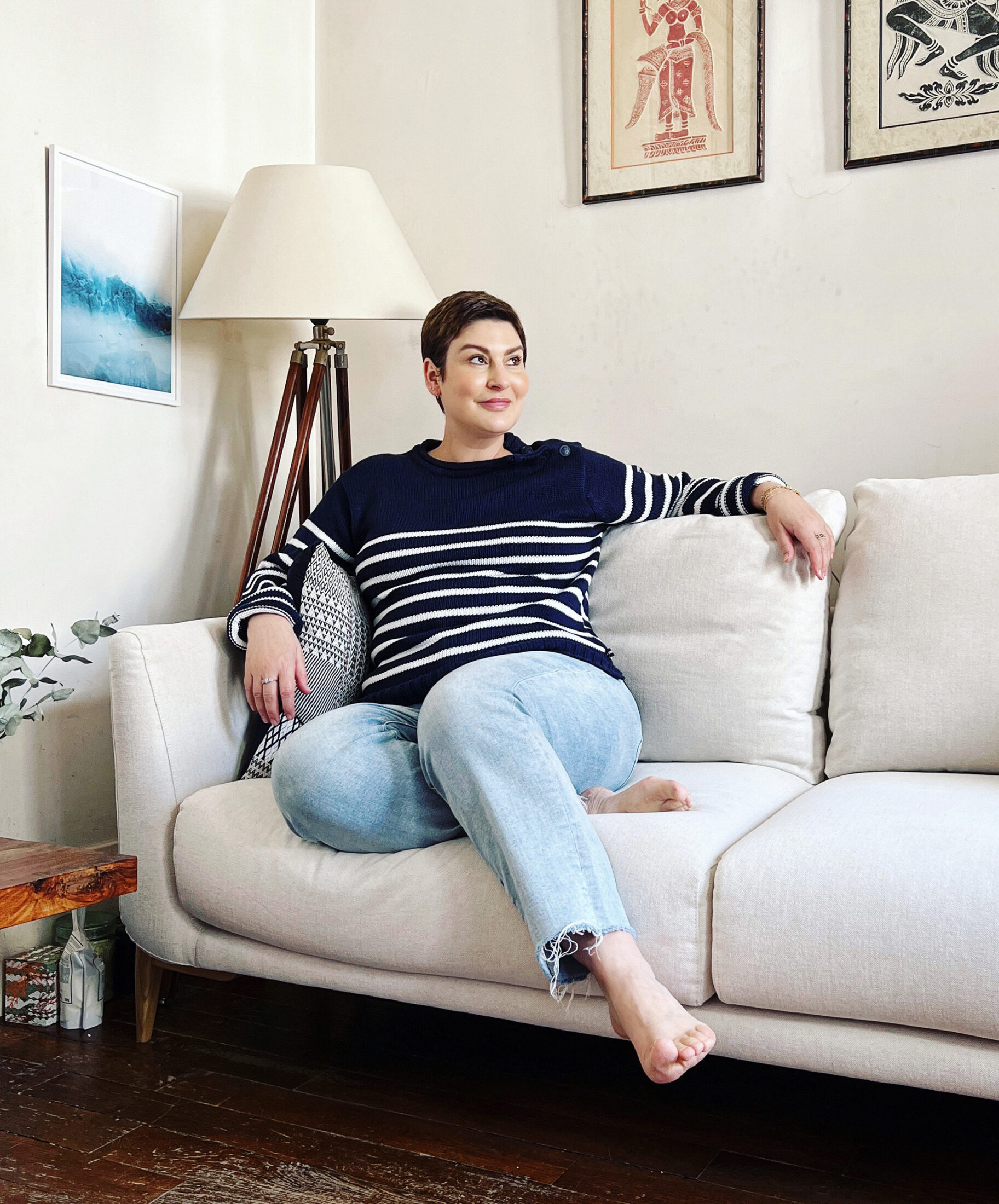 C’est marrant parce que je suis militaire et je porte du bleu marine tout les jours. Alors autant te dire que pour moi c’est no way ! Impossible d’en porter à la maison ! Même si, je l’avoue c’est une couleur assez chic sur un jean par exemple ! En tout cas la marinière te va très bien (et ne fait pas du tout coincée !)!