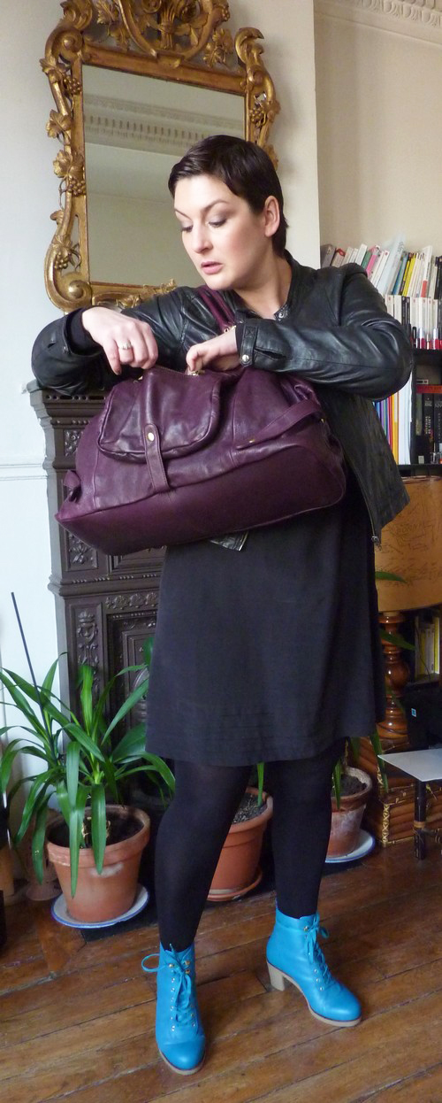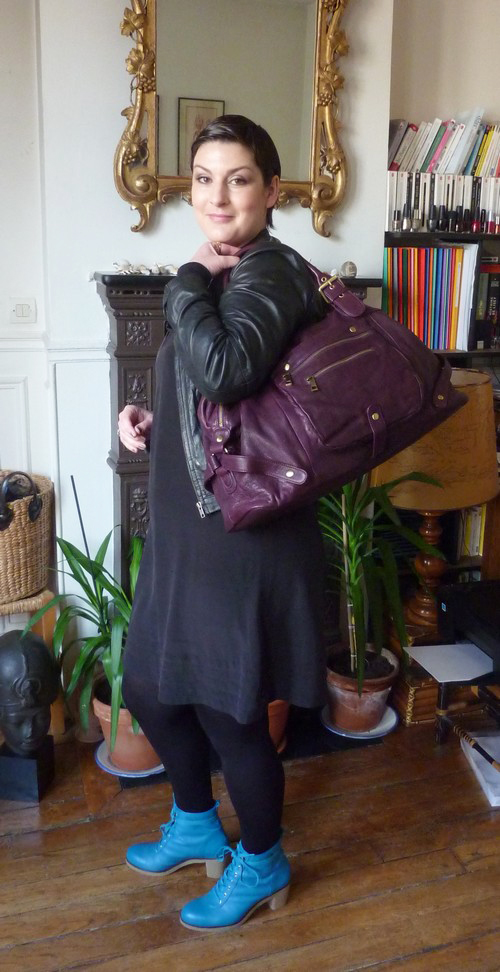 Je trouve le sac très astucieux, mais j’ai carrément flashée sur les bottines, la couleur, la forme, c’est super original et ça te va très bien !