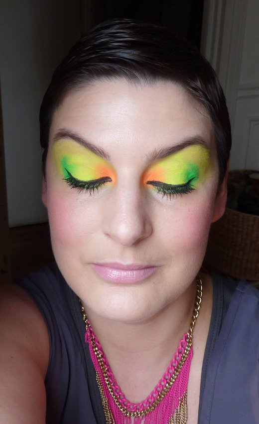 Ce maquillage neon serait parfait pour ma zumba party de samedi soir!! Dommage que je n’ai pas la palette sleek acid….. snif…..