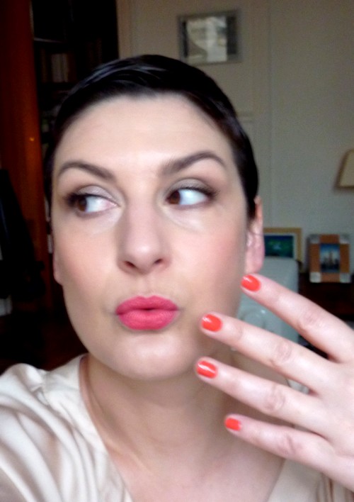 Sauf que moi, je n’ai pas l’habitude et que le rose pale ne me va pas au teint….et que seul les rouges légèrement corail, avec un pointe de marron, de rouge pour les filles rousse que je suis (rousse foncée)……..