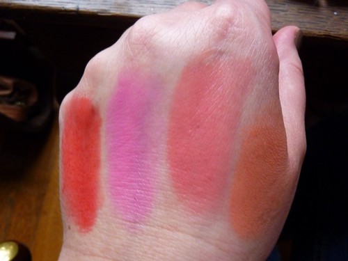 Et c’est là qu’on voit que le Rude (au bout à droite) est en fait vachement orange, comparé au Dixie qui est juste à côté de lui et est plus un vrai corail (et qui, je pense, va devenir mon nouveau blush préféré).