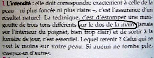 Selon eux, il faudrait essayer le fond de teint sur sa main. J’ai cru m’évanouir d’effarement. On sait toutes que ça ne marche pas, la peau des mains n’étant pas de la même couleur que celle de la figure (et puis de toute façon vous n’allez pas porter votre fond de teint sur les mains).