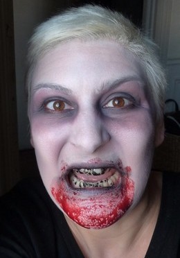 Merci Hélène. j’ai justement une soirée déguisée samedi. Après des heures à rechercher un déguisement sur des sites, j’ai finalement décidé de tout miser sur le maquillage. je me suis donc inspirée de tes vidéos, d’une de Pétrilude et d’une des soeurs de Pixiwoo. Mon mari et moi allons incarner un couple de jeunes mariés zombies. Nous allons donc remettre nos tenues de mariés. Voilà mon mari à notre premier essai maquillage. Pour moi, je vais faire un mélange de ton monstre de la cave (qui aurait bouffé le visage de mon mari) et la corpse bride de Pixiwoo. Je t’enverrai une photo. Encore merci. On s’éclate!