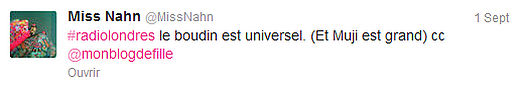 Je n’y connais rien en tweet mais « radiolondres » m’intrigue. Du coup je ne sais pas si c’est pour le nom de quelqu’un ou exprès comme « dansedejoie », mais ça m’a bien fait rigoler d’imaginer le message « le boudin est universel » sur TSF avec le fameux « pompompompom ». Alors merci pour la rigolade :)