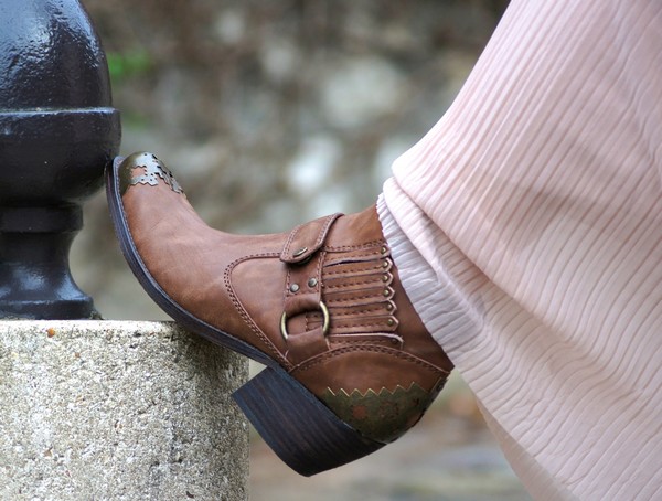 Oh ben dis donc, t’es vraiment canon comme ça. Quel look superbe et original. Les boots et ta veste se marient à merveille je trouve. Et les bijoux indiens alors là, n’en parlons même pas, tellement ça va bien avec le tout. Si je possédais ces merveilles que sont tes boots et ta veste, je porterais un beau blue jean bien délavé et un t-shirt tout simple légèrement ample, porté négligemment dans et sur le jean, avec d’énormes boucles d’oreilles, en accessoire. Ca c’est mon look de tous les jours. Mais je sais aussi être « tirée à quatre épingles », « chic et snob », « grunge » ou « love and peance – bohème », « classique » ou au contraire « ultra moderne », « sobre » ou « (très) rock and roll ». Je n’ai pas de style personnel. Je me fringue comme je le sens, suivant l’humeur du jour et mes envies.