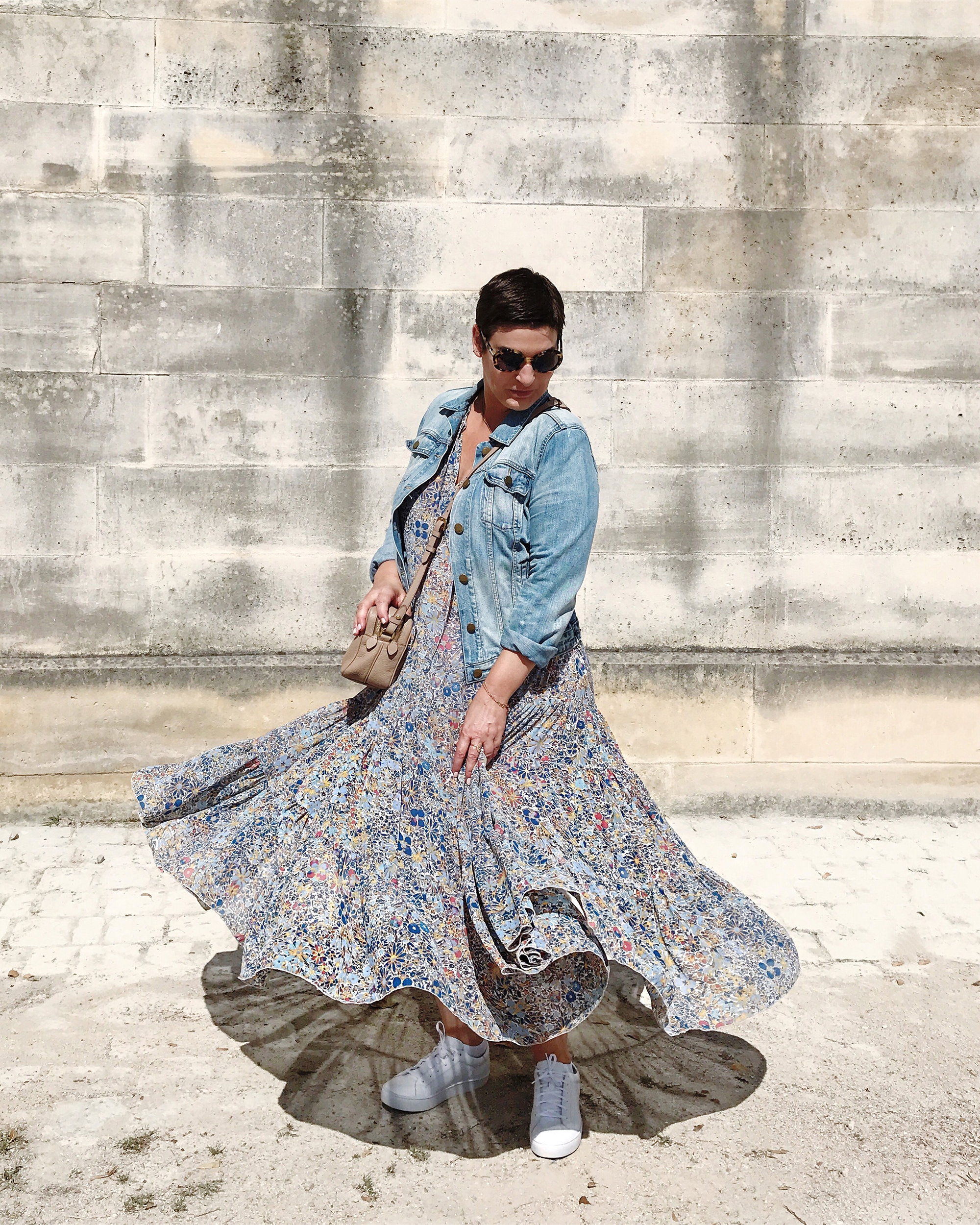 C’est mon look de l’été jusqu’au type de sac ! Et pourtant, du haut de mes 160 cm, ce n’était pas gagné. En choisissant le bon modèle, je crois que toute fille peut être jolie en robe et baskets. Cela dédramatise tellement la robe, le plaisir le l’hyper féminité (la robe, les fleurs) sans le côté dame. Avec une robe courte c’est joli aussi mais si on est maquillée, y’a un truc bizarre qui se passe, comme quelque chose qui va pas entre le corps et le visage.