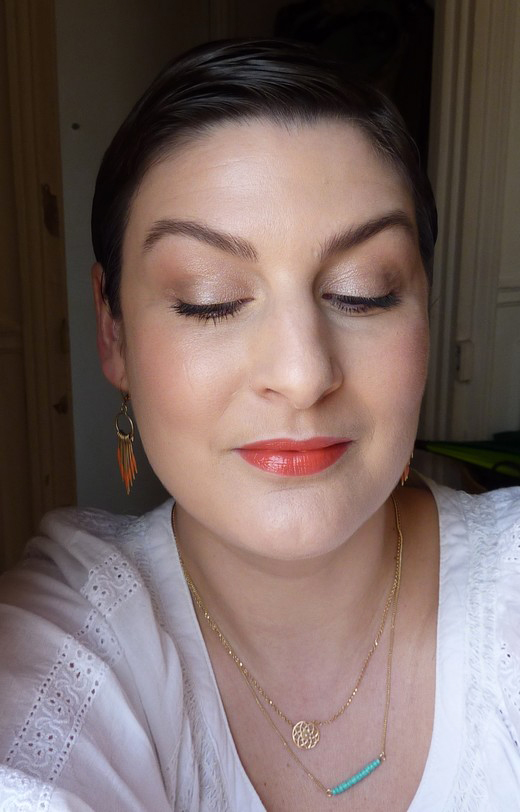 Je me permets de commenter parce que j’ai flashé sur ce maquillage hyper frais et estival. J’ai essayé de le refaire mais un peu à ma sauce evec un maquillage nude à base de fards urban decay (baked, smog et midnight cowgirl) et de vernis à lèvres YSL orange de chine. Alors, c’est un peu plus pailleté au niveau des yeux (mais comme je plisse des yeux quand je souris, c’est mieux, sinon ça me fait des tout petits yeux). Mais j’adooooooooooooore (et pourtant en général,je n’aime pas refaire les looks beautés parce que je ne trouve pas que ce soit « moi »).