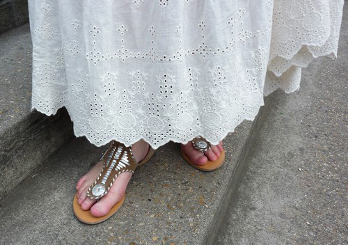 Très jolie la jupe un peu bohème en broderie anglaise, tu pourrais stp, me dire ou tu l’as trouvé, car justement j’en cherche une comme ça en ce moment…. et puis tes sandales un peu « indienne », elles sont juste canons ! Une tenue comme j’aime, à la fois chic et décontractée !
