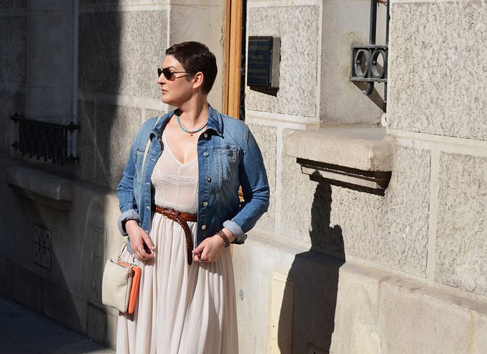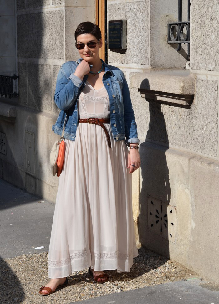 LA robe longue et fluide avec la veste en jean : une association qui marche du feu de dieu !! J’aime beaucoup ce type de look, c’est typiquement ce que j’ia envie de porter tous les jours en été (enfin quand il fait beau hein^^).