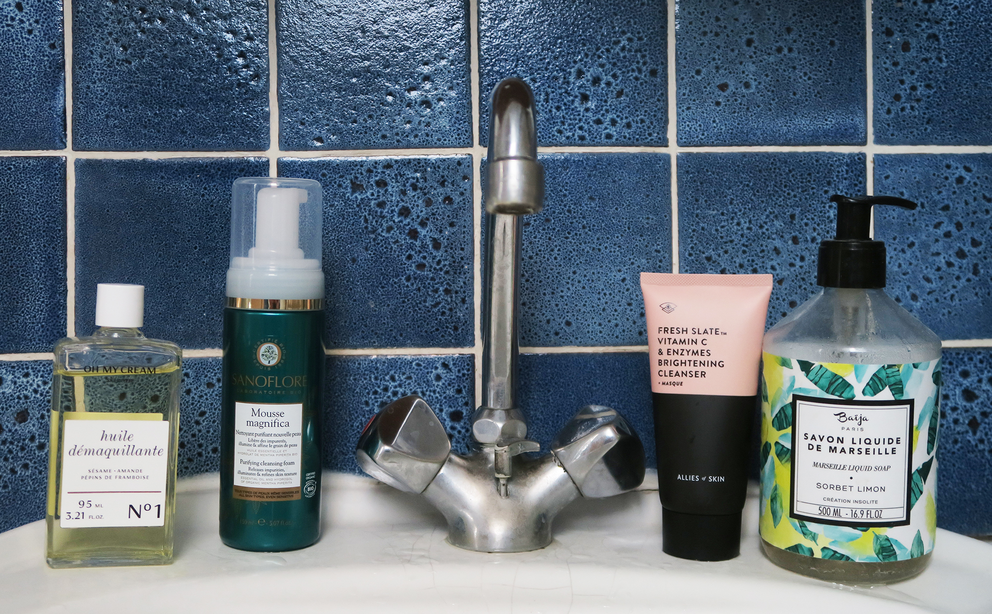 En ce moment (et depuis un bon moment), j’utilise l’huile démaquillante de chez Decléor (je l’ai trouvée en grand format de 400ml chez Nocibé, joie je suis), retirée après rinçage avec une lingette en microfibre, puis suivie de la mousse nettoyante de chez Avène (que j’utilise aussi le matin quand j’en ressens le besoin, sinon c’est juste rinçage à l’eau avec une lingette microfibre).