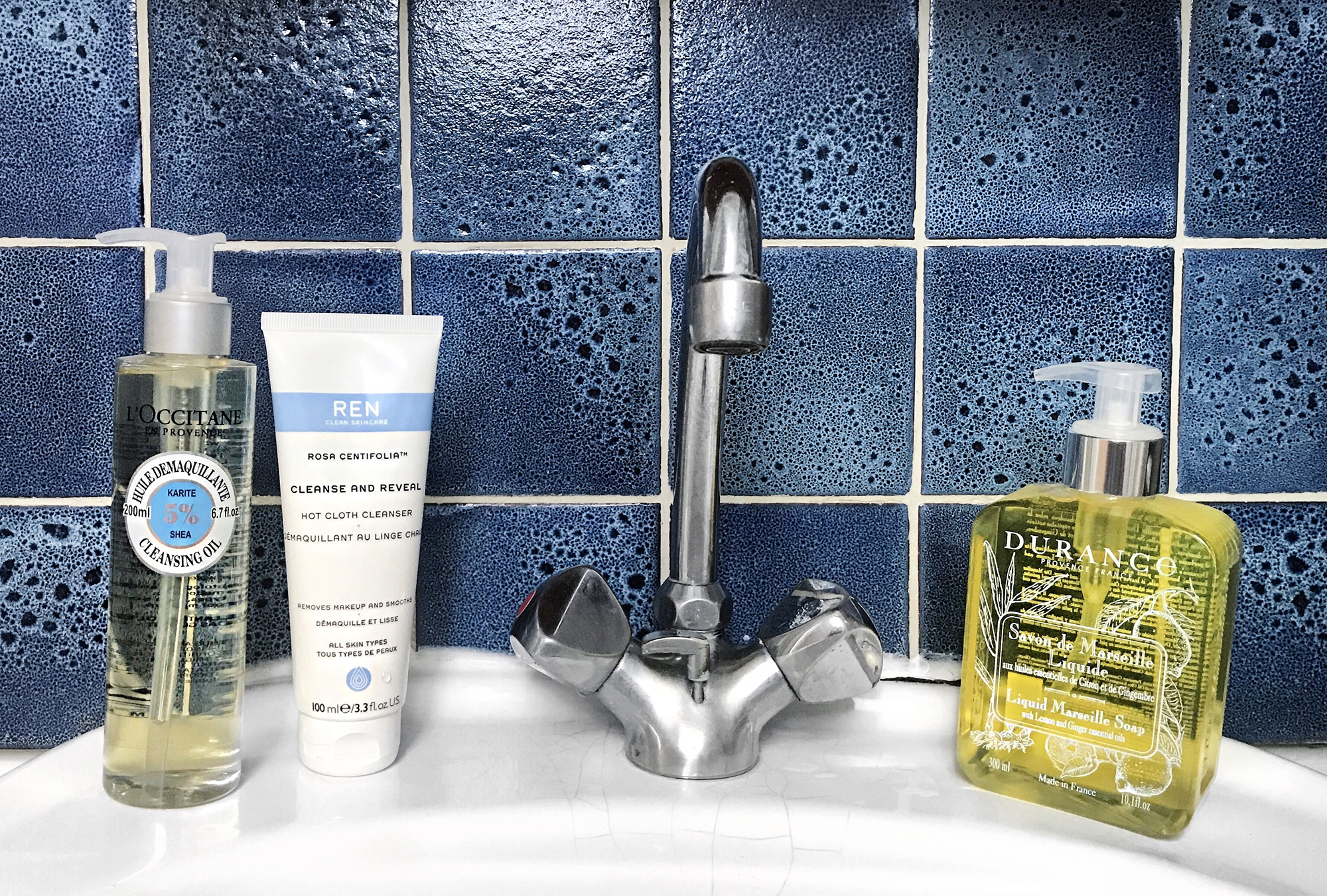 Pour moi en ce moment sur mon lavabo c’esten premier nettoyant le lait en huile démaquillante de la gamme à l’immortelle chez l’occitane, perso j’adorais l’huile karité mais je trouve l’odeur très agréable dans son genre. Ensuite soit le lait nettoyant evercalm de ren sois si je ressent le besoin d’un nettoyage plus « costaud » c’est le nettoyant defense de chez Paula’s Choice pas d’odeur particulière mais une mousse épaisse et ultra agréable, évidemment il n’assèche pas du tout la peau. Pour les mains j’ai le gel lavant Philosykos de diptyque dont j’adore l’odeur verte de feuille de figuier mêlé à la douceur lactée de la figue.