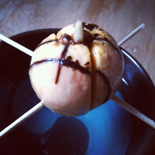 2. Piquez 3 ou 4 cure-dents dedans pour pouvoir le mettre dans un bol d’eau, la pointe en haut (je sais pas pourquoi non plus mais tout le monde insiste lourdement sur la pointe en haut ; je suis pas contrariante, j’ai mis la pointe en haut)