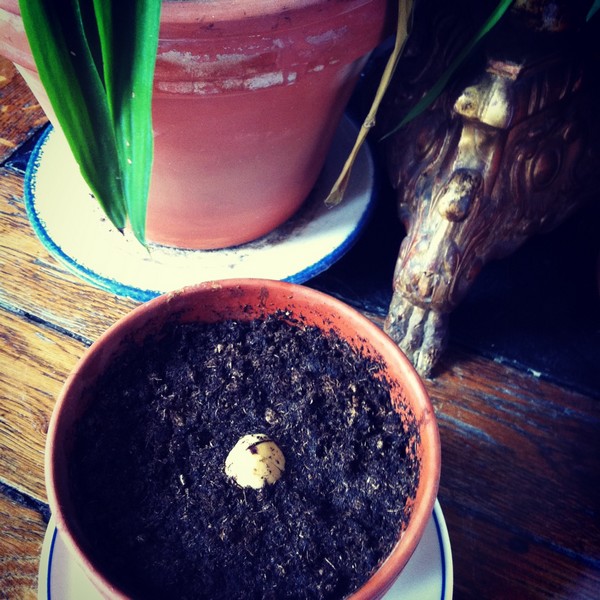6. puis plantez le noyau. Dans de la terre, donc, avec la racine vers le bas (sans blague). Moi j’ai même pas retiré les cure-dents de peur d’abîmer le noyau. Et puis je l’ai laissé dépasser un peu de la terre parce que j’avais vu des photos comme ça, ça veut pas dire que j’ai raison et si ça se trouve on peut l’enterrer complètement (je compte remettre de la terre par-dessus ensuite)
