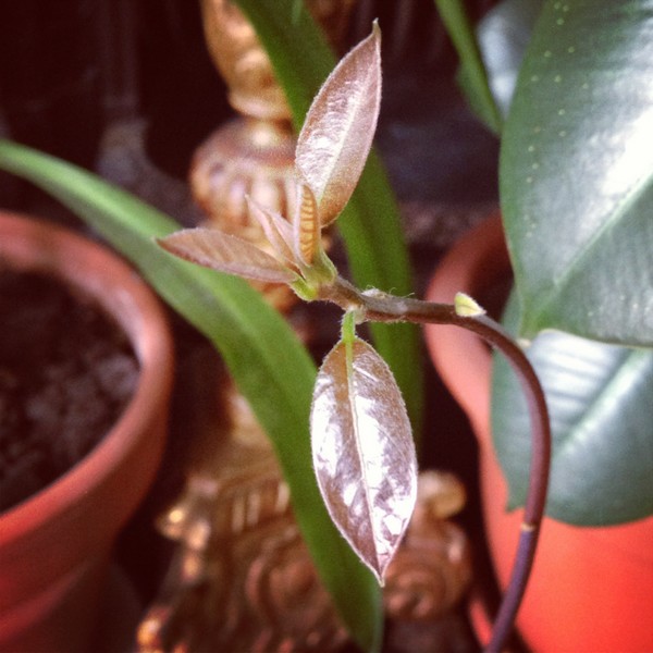 J’ai récupéré il y a quelques mois une branche de caoutchouc que j’ai mise dans un vase juste pour la déco, mais comme elle tenait bien le coup je l’ai gardée longtemps et elle a fini par faire des racines. Je l’ai mise en terre dans un pot, et maintenant il y a de nouvelles feuilles, et même un début de nouvelle branche :-)
