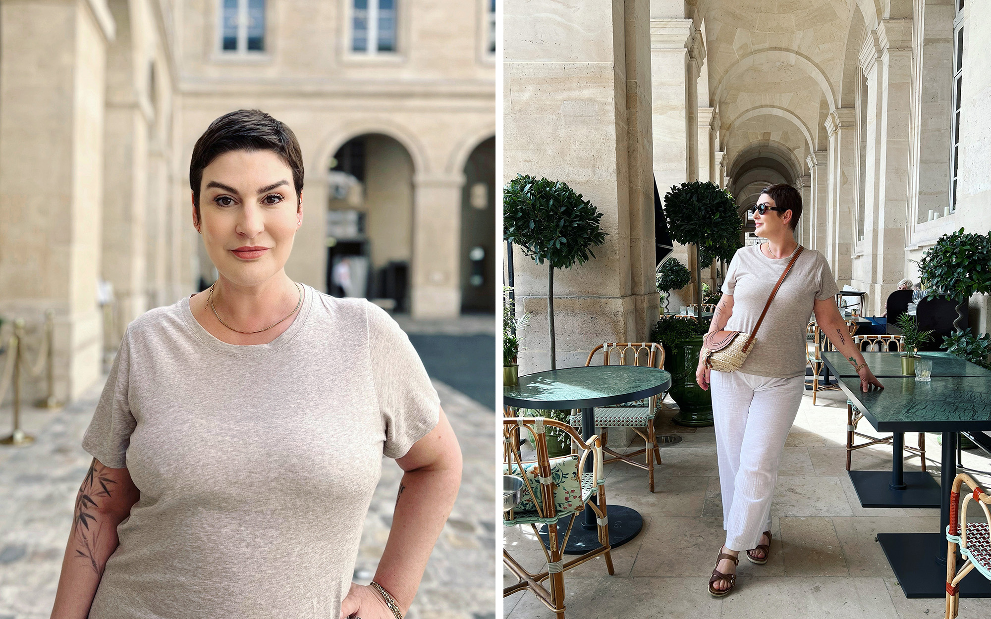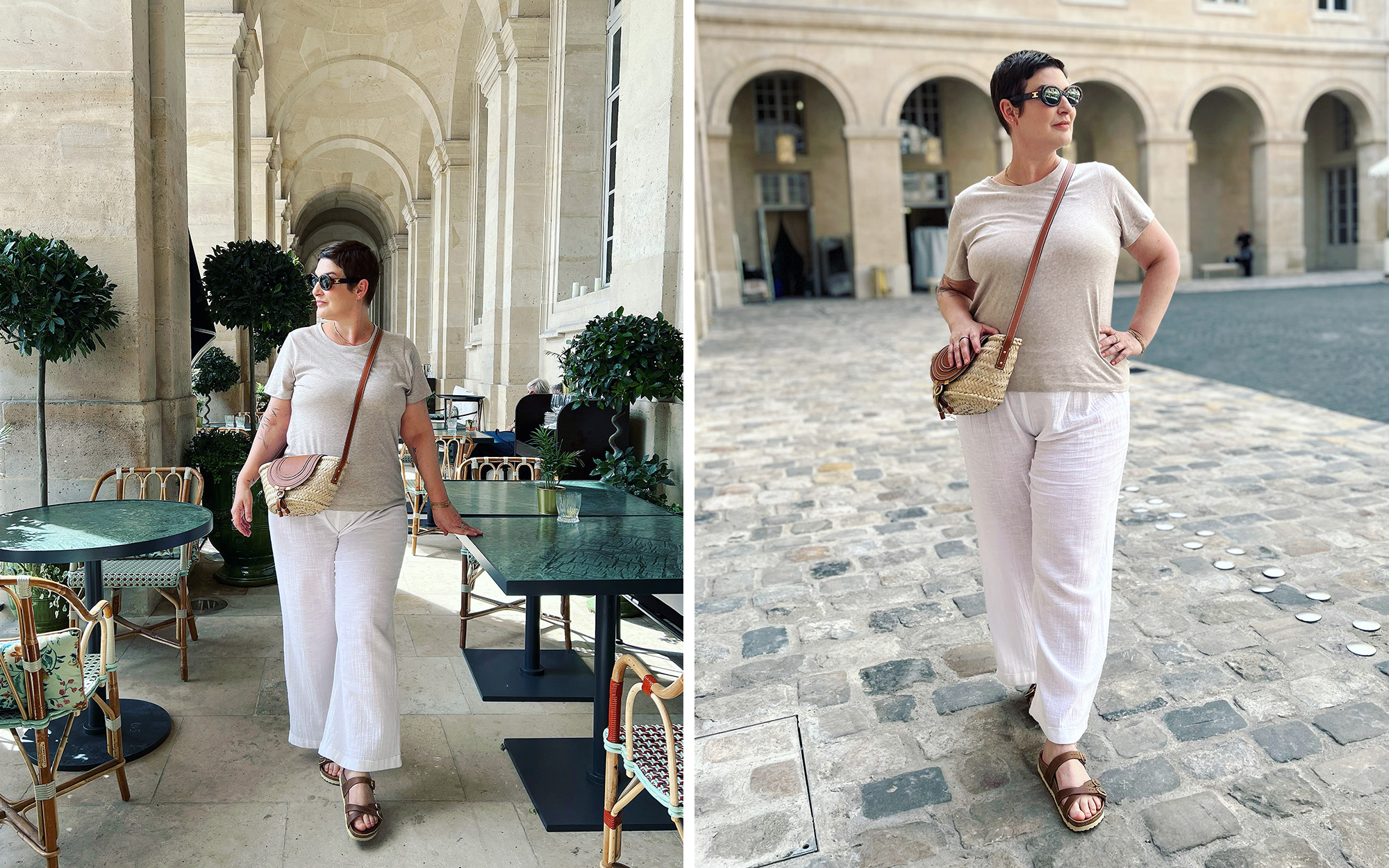 Cette tenue vous va très bien, je me pose la question des sous-vêtements, pas facile pour en trouver des invisibles et confortables sous un pantalon clair de type pyjama, non ? Bel été !