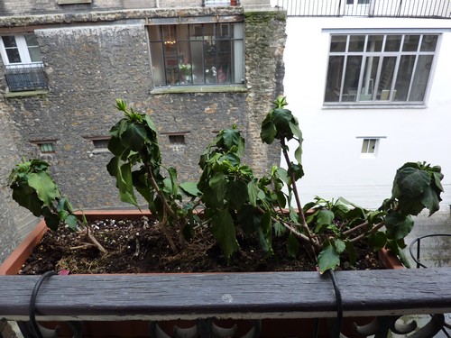 Coté chambre (où genre en plein mois de juillet il y a 2h de soleil par jour), j’ai un olivier que je chéris très fort parce qu’il était à ma mère, et des hibiscus achetés trois francs six sous et qui se sont révélés hyper florissants jusqu’à mi novembre.