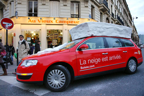 J’adore l’idée des voitures couvertes de neige qui circulent à Paris. Je trouve que l’office du tourisme suisse est de plus en plus original depuis quelques années. Tant à l’étranger qu’en Suisse même, pour nous inciter à voyager dans notre propre pays. ça va de pair aussi avec de la pub pour les fromages suisses avec concours dans tous les magasines de cuisine, etc…