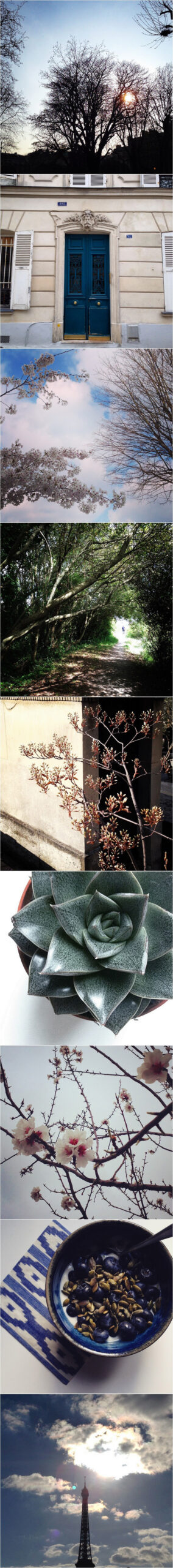 Du vert, du bleu, des fleurs, ça se sent qu’à Paris on a beaucoup attendu le printemps ? Ca commence enfin à arriver et j’observe avec émerveillement les bourgeons apparaître ici et là (en mangeant des myrtilles, donc ;-) !